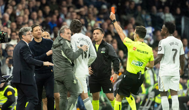 随后,巴尔韦德、罗德里戈先后因为抗议被黄牌警告,金特罗还向皇马替补球员出示红牌。在《比赛报告》,金特罗透露,恩德里克“因为起身离开替补席,走出技术区域,对着第四裁判大喊大叫,不得不被教练团队拉住”而被出示红牌。